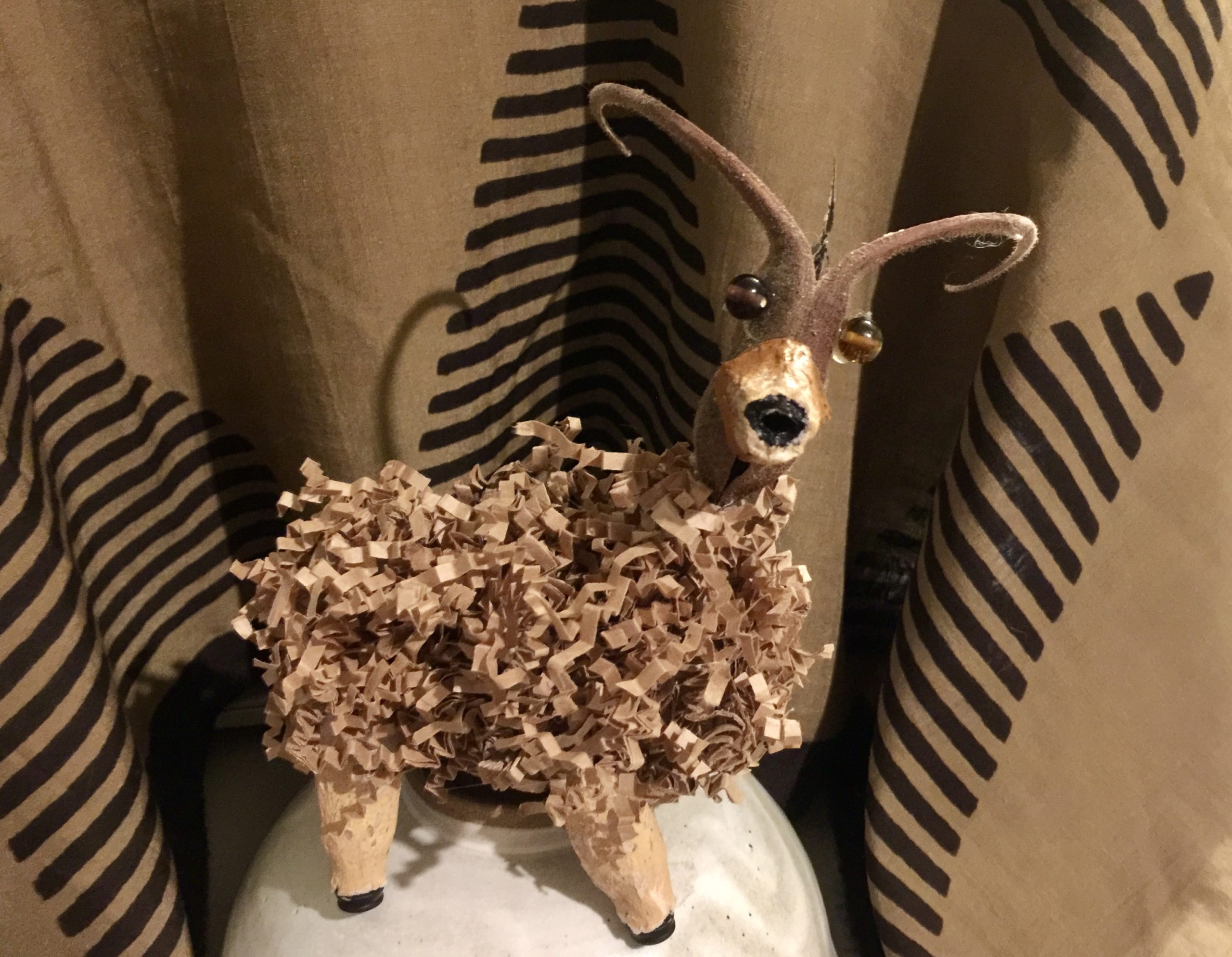 The seedpod of a Ram’s Horn wildflower served as inspiration for this mountain sheep. With a miscellany of other recycled bits (including toilet paper roll for body, packing peanuts for legs, curly paper bits from package stuffing, hooves made of stoppers from tiny dog medicine syringes…) Anyway, I wanted a mountain sheep for a little puppet skit I want to make, so voila!