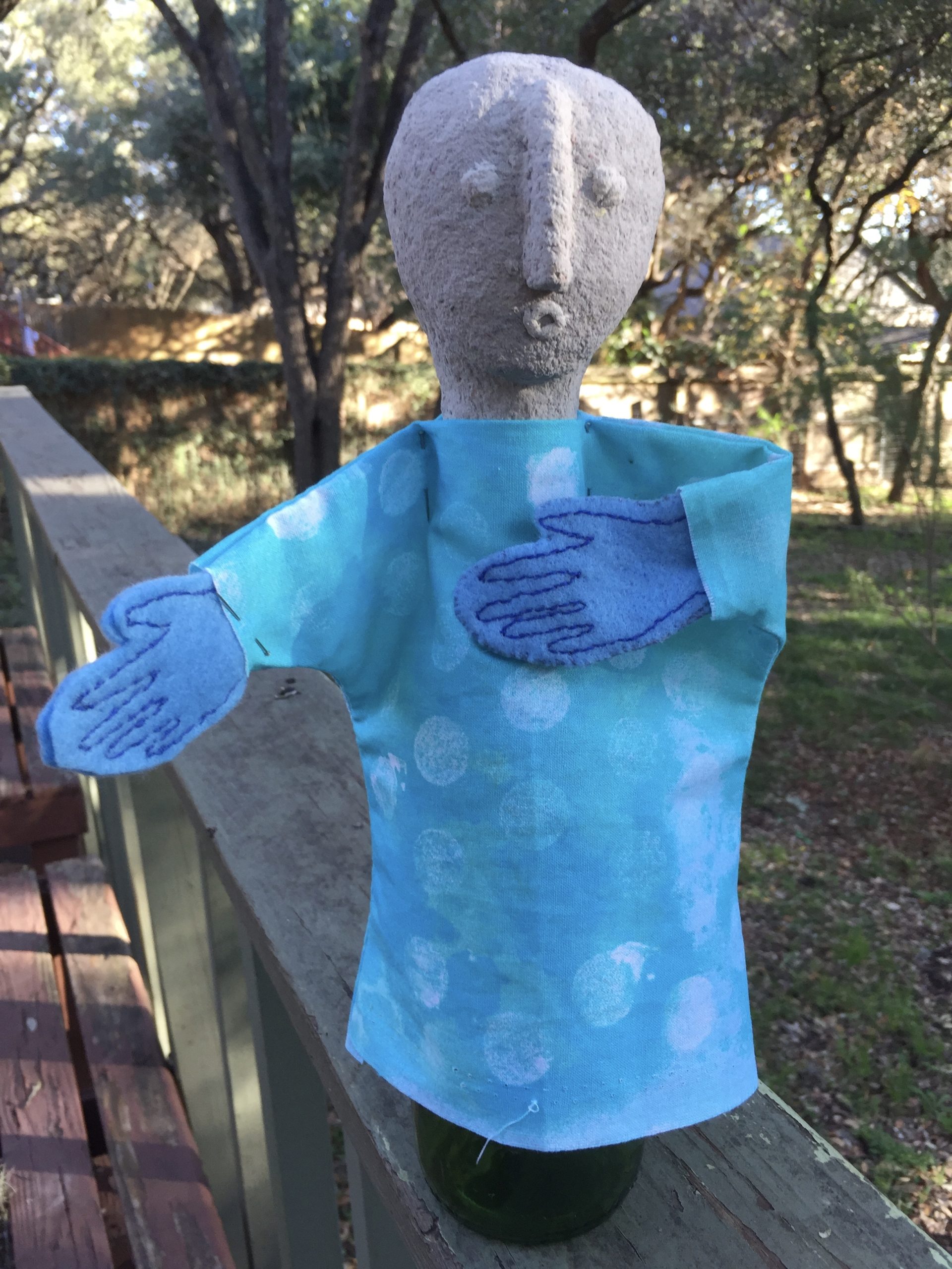 She has hands and the beginnings of a garment! The garment is from a scrap of block printed fabric a friend wrapped a Christmas present in. Her hands are embroidered scraps of blue felt. I intend to make a series of puppets using only materials I already have, including (most specially) pieces of lace tatting and crochet made by my grandmother and great-grandmother (I have drawerfuls of doilies, table-runners, lace collars and skirt trimmings – objects in many cases a century old.)
