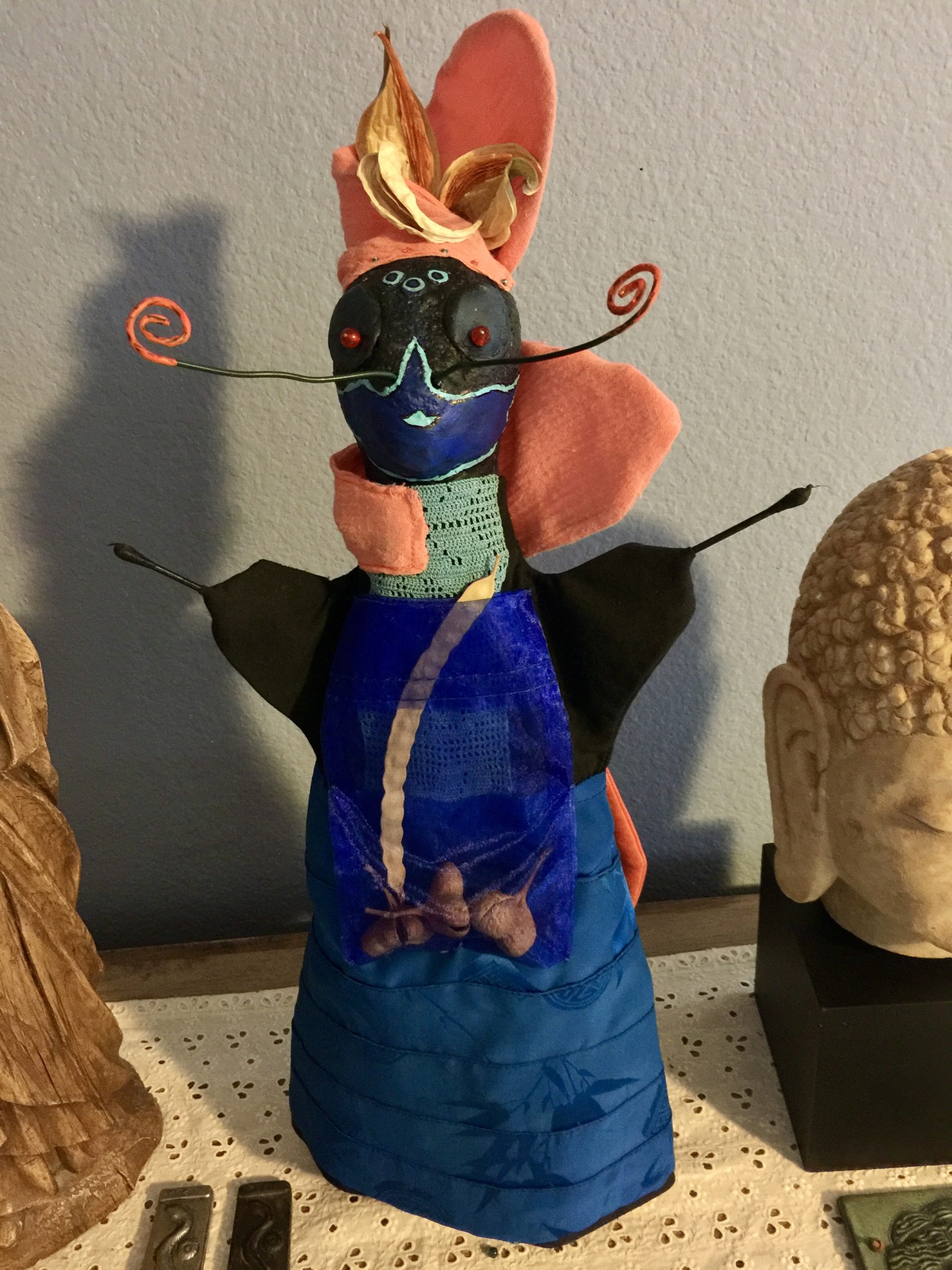 I’ve enjoyed encountering various wasps this summer, too. The (obsidian black and sapphire blue with orange wings) tarantula hawk wasp is a large and beautiful being, while also a bit terrifying. To tarantulas, that is. While the male wasps lack a stinger and hang out on flowers and get tipsy on fermented fruit, the females lure and attack tarantulas that they paralyze with their sting, drag into their nest, and lay an egg on. Once the larva hatches, it devours the tarantula from inside out. Yes, rather gruesome (I do feel sorry for the tarantula). Tarantula hawk wasps also pollinate some of my favorite native plants: zizotes milkweed (a host for monarch butterfly caterpillars) and Mesquite and Mexican Buckeye trees. My new puppet is inspired by the tarantula hawk wasp (scientific name is Pepsini) — her headress holds zizotes milkweed pods and her potions bag holds mesquite and buckeye seedpods — a reminder that this fierce (to tarantulas) insect also nurtures plants that host and feed many other creatures. Oh, and although the tarantula hawk wasp generally ignores any nearby humans, you wouldn’t want to try to catch or otherwise threaten one, given that its sting is reputed to be the second most painful insect sting on the planet.